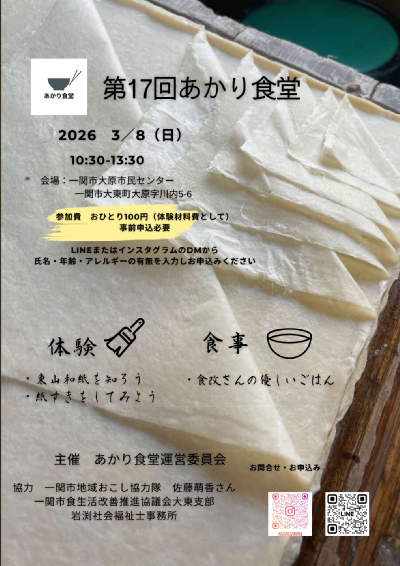 | 第17回あかり食堂のご案内 2026年3月8日(日) 10:15 受付開始 10:30〜12:00 *体験のじかん「紙すき体験」 講師 一関市地域おこし協力隊 佐藤萌香 様 (1)東山和紙を知ろう! (2)紙すきをしてみよう! 12:00 *食事のじかん 一関市食生活改善推進協議会大東支部の会員さんによる優しいごはん 13:00 ごちそうさまでした(後片付け) 13:30 終了 【会場】一関市大原市民センター 住所:一関市大東町大原字川内5-6 【参加費】おひとり100円(体験材料費として) 当日受付で集めます 【定員】おとな子ども合わせて20名 【持ち物】特になし 【申込み】 事前のお申込みが必要です。Line公式アカウント(https://lin.ee/sB6viHxG)のメッセージまたはInstagramのDMで、次の内容をお知らせください。定員に達しましたら募集を終了します。 (1) 参加人数 (2) 参加者の氏名(全員) (3) 参加者の年齢(全員) (4)食物アレルギーの有無 |